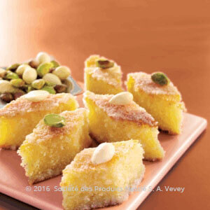 2. يُسكب المزيج في صينية للخبز قياس 28 سم x 24 سم ويُسوّى الوجه بشكل متجانس. تُخبز البسبوسة في فرن محمّى على حرارة 190 درجة مئوية لمدة 35 دقيقة أو حتى يصبح لون الوجه ذهبياً.