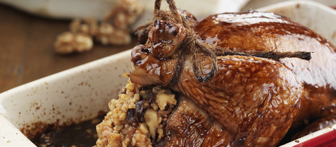 8. يُقطّع الدجاج ويُقدّم على طبق مع الحشوة والسوائل الناتجة جانباً.