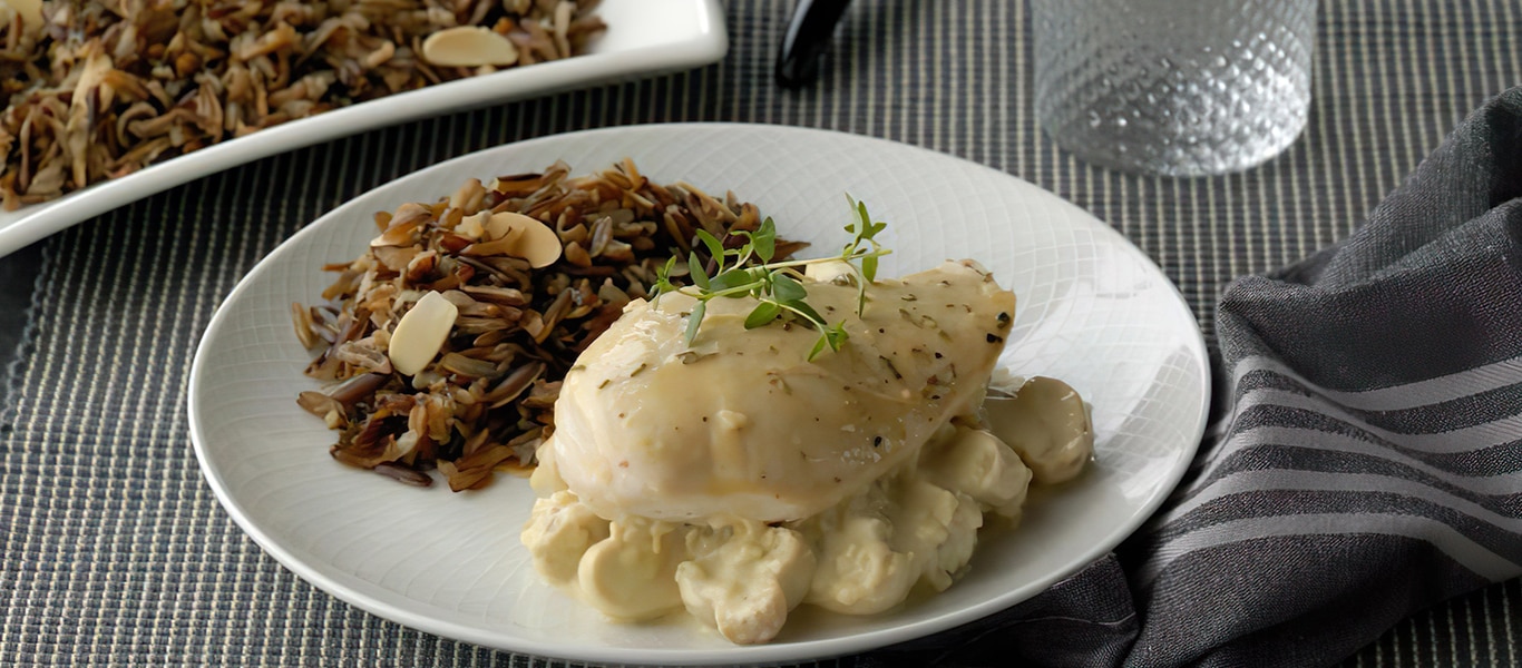 4. لتحضير الصلصة، يُغلى الماء مع مكعّب مرقة الدجاج ماجي ملح أقل وعصير الليمون الحامض، ثم يوضع الفطر في هذا المزيج لمدّة 5 دقائق. يُقلّى البصل المفروم مع الزبدة ويُضاف عصير حامض اللّايم، والفطر، والكريما، ويُطهى المزيج على نارٍ خفيفة لمدّة 10 دقائق. يُقدّم في أطباقٍ ساخنة مع وضع الدجاج على السطح والأرز جانباً.