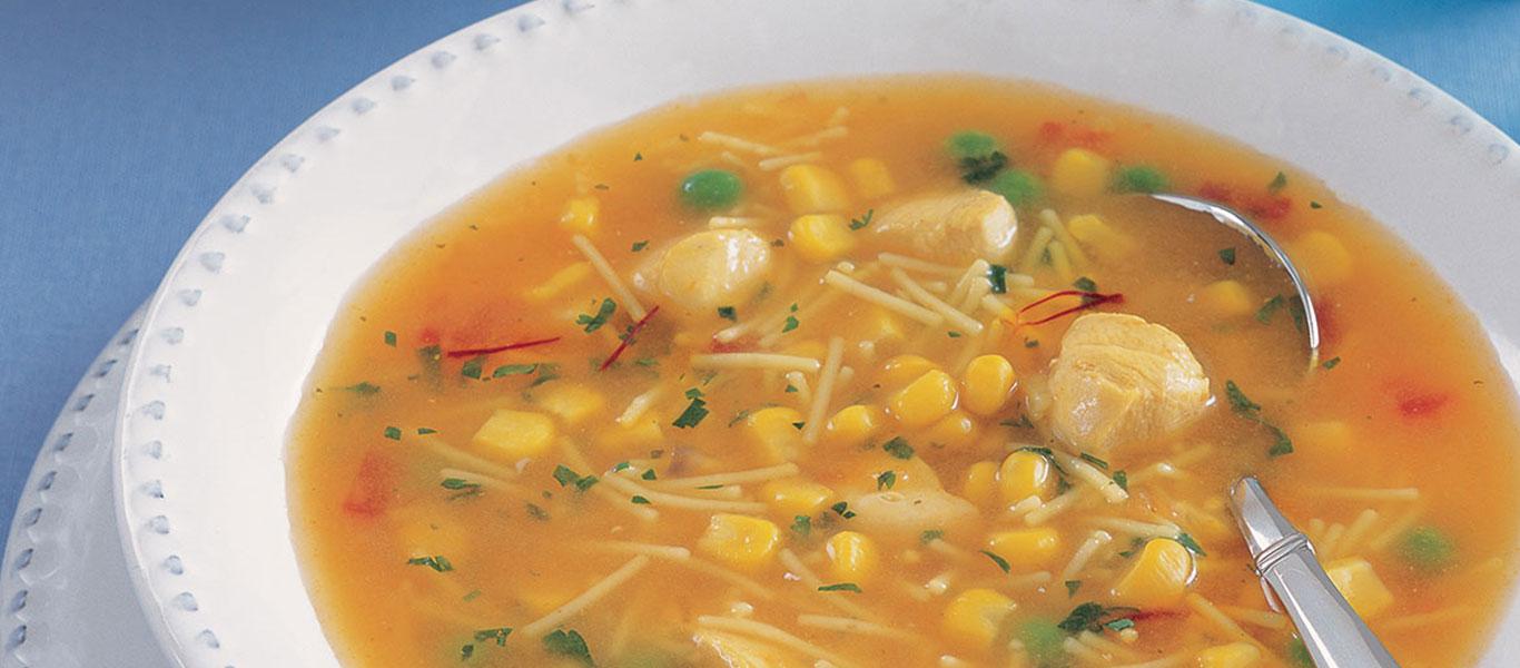 2. Add tomato paste, water, green peas, sweet corn, MAGGI Chicken Noodle Soup and saffron. Bring to a boil and simmer uncovered with occasional stirring for 10 minutes then serve.
